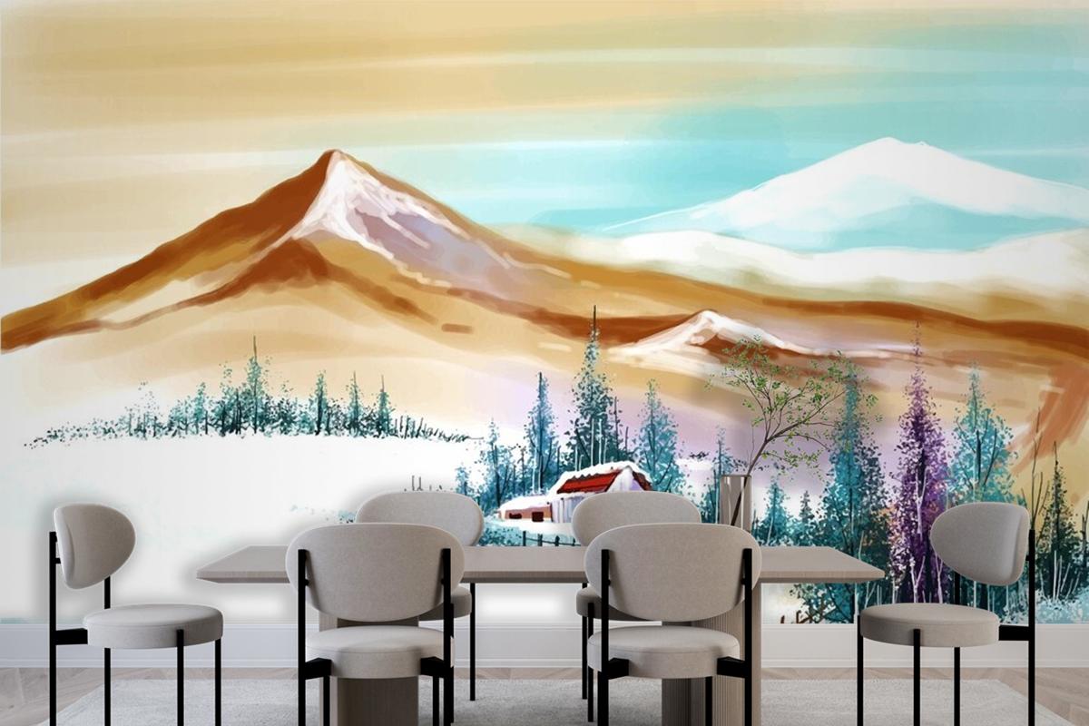 Yeni Yıl Ve Noel Ağacı Dağlarda Kış Manzarası Yemek Odası Duvar Kağıdı