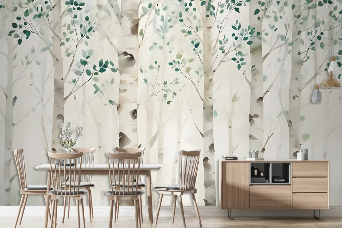 Yeşil Kahverengi Küçük Yapraklı Suluboya Tarzı Orman Duvar Kağıdı