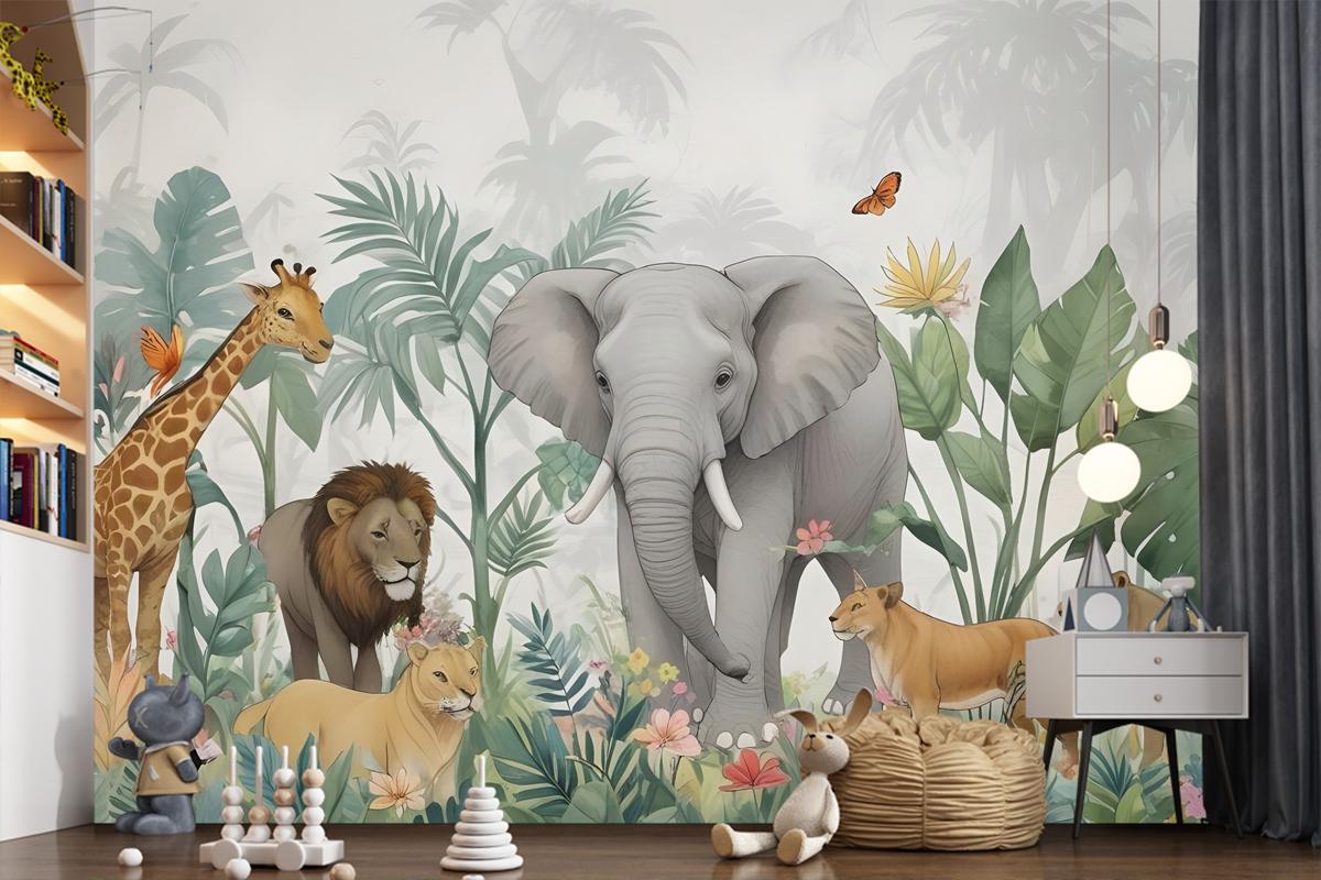 Yeşil Yapraklı Çocuklar Tropikal Safari Hayvanları Çocuk Odası Duvar Kağıdı
