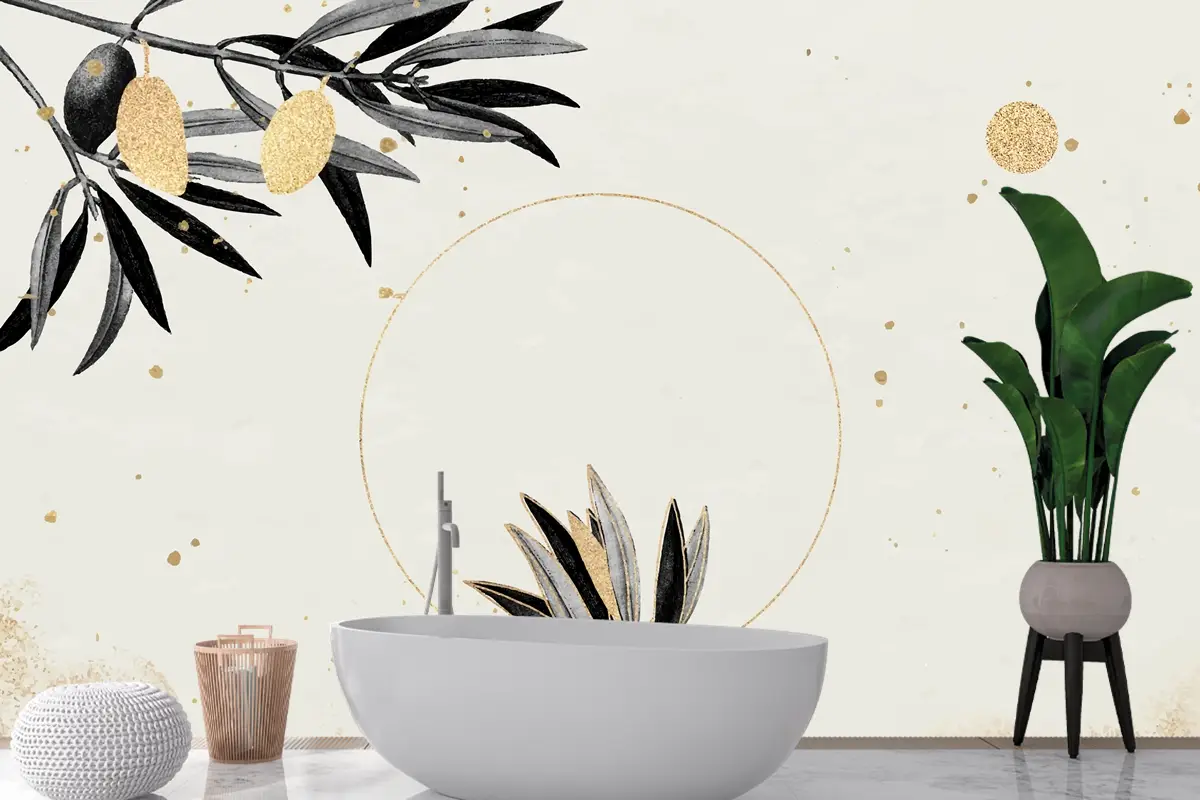 Zeytin Dalları Ile Yuvarlak Altın Çerçeve Banyo Duvar Kağıdı